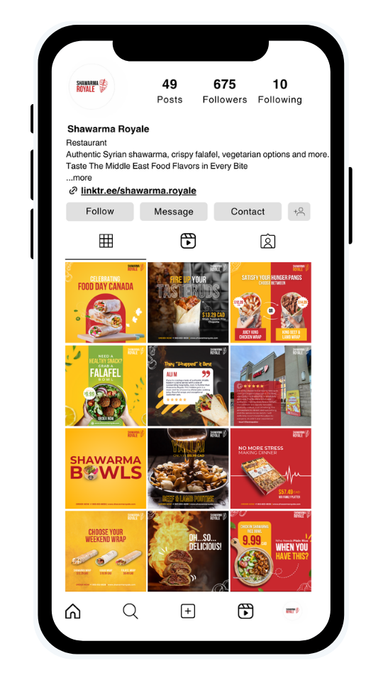 We developed a tailored marketing and research plan plus a cohesive brand identity that strengthened Shawarma Royale’s unique positioning in the competitive casual dining scene. Our social media posts and content strategy boosted engagement and showcased their bold, flavour-rich menu to hungry audiences online. We also delivered eye-catching flyer designs that elevated local visibility and drove foot traffic to the restaurant.